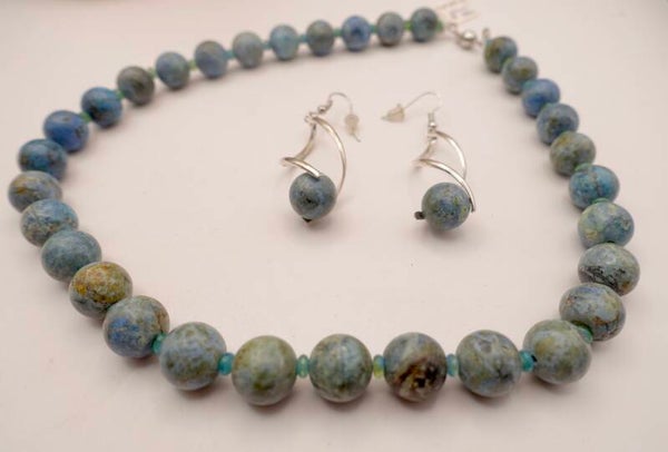 Blauwgrijze, gedraaide oorhangers van blauw Pietersiet/Stormsteen, een prachtige steen waar mooie eigenschappen aan worden toegeschreven. Ook heel mooi in combinatie met de ketting KKtu023125. Totale lengte ca. 6cm.