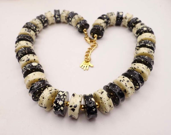 KKzw013125: Zwart met ecru gestippelde ketting, met leuke schijfkralen.