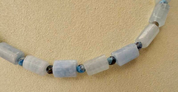Hemelsblauw kettinkje van aquamarijn en natuursteen. Aquamarijn tonnetjeskralen, afgewisseld met kleine gemêleerde, natuursteen, facetgeslepen kraaltjes.