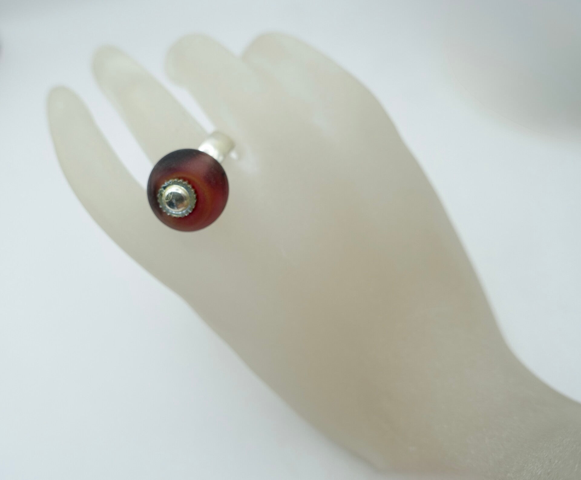 Burgundy-rode ring uit eigen atelier. Gebrand achter de brander. Met draaiknopje, zodat je kunt wisselen tussen de kralen. Mt.19.