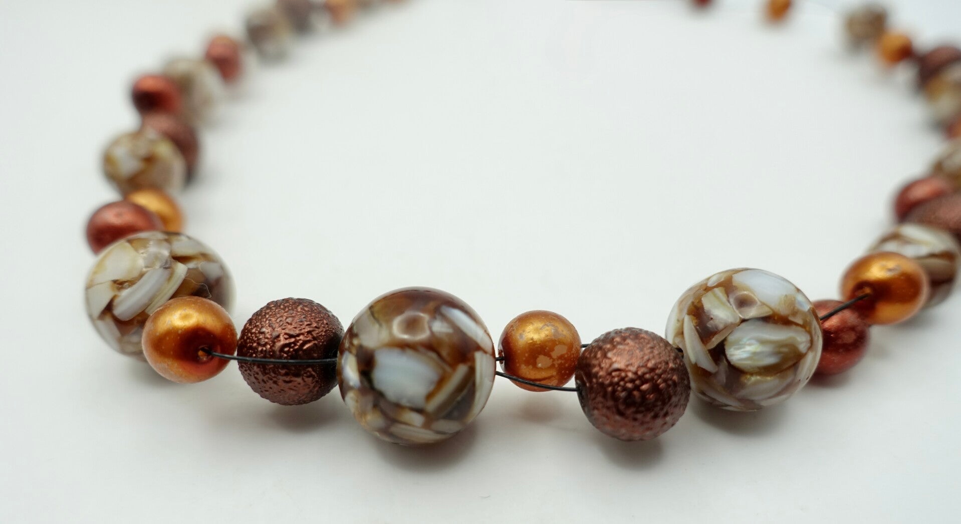 Bruine, koperkleurige ketting van parelmoer, ijsparels en glasparels. Warme tinten, lekker licht. Helemaal van nu!