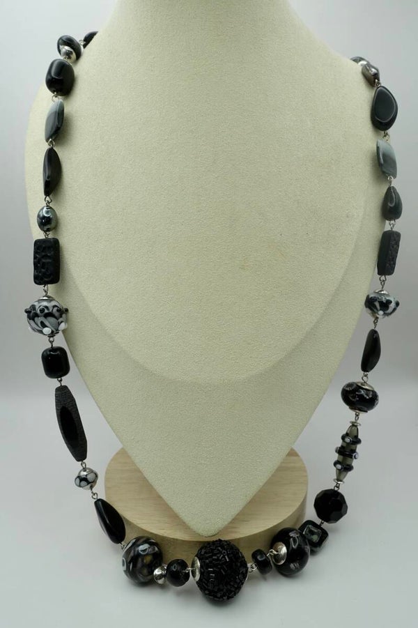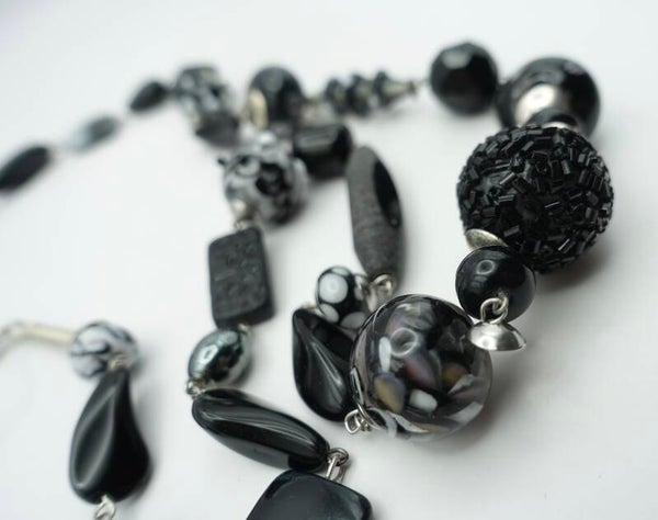 Zwart/witte ketting van o.a. handgemaakte kralen van glas, metaal, etc. Allemaal verschillend. Een groot aantal kralen is achter de brander gemaakt in eigen atelier.