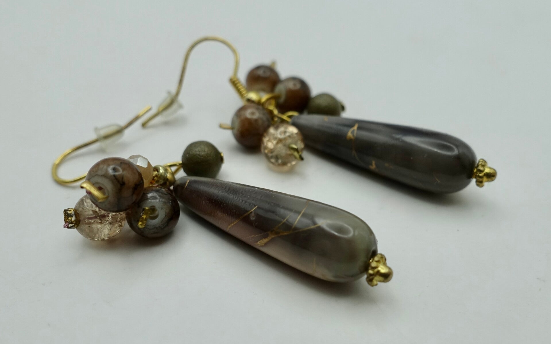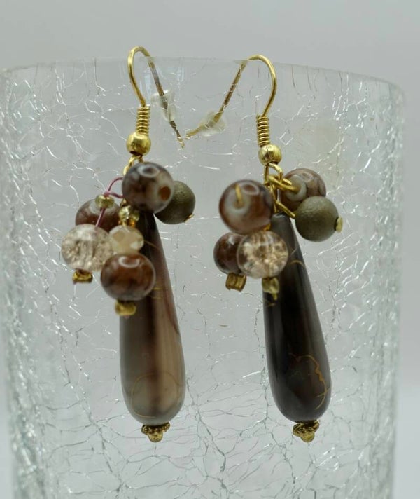 OBbr013925: Bruin/ecru gevlamde oorhangers met diverse kleine kraaltjes.
