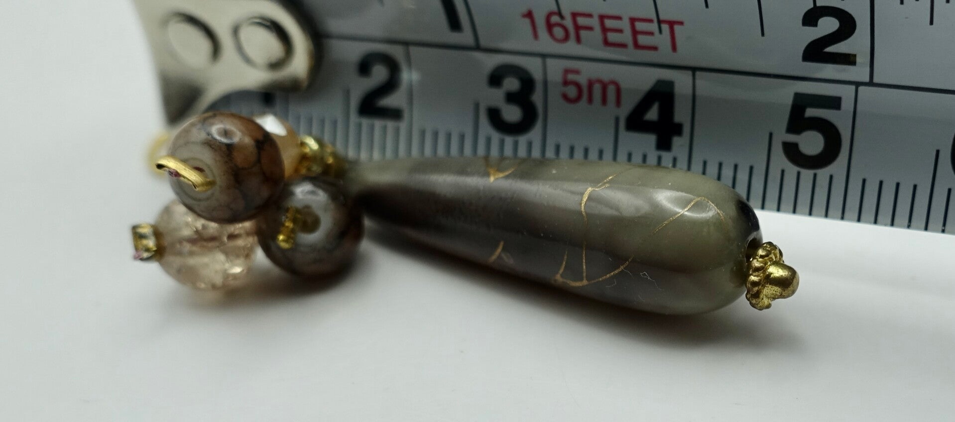 Bruin/ecru gevlamde oorhangers met diverse kleine kraaltjes. Gemaakt van voornamelijk resin, dus super licht. Totale lengte ca. 5cm. Afgewerkt met nikkelvrij goud-metaal hangers.