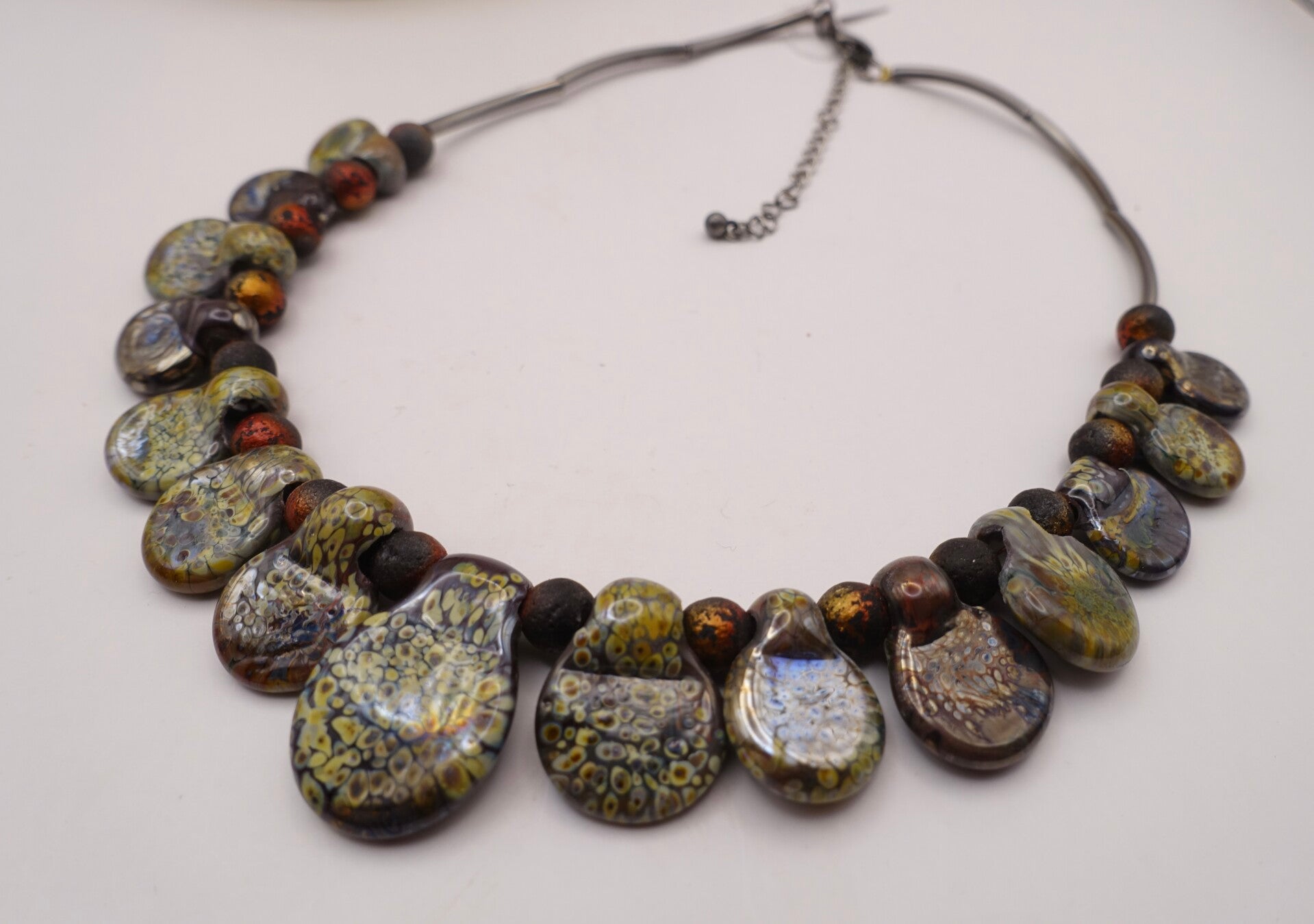 Prachtige ketting van handgemaakte glaskralen in taupe, groen, paars, etc. met raku frit bewerkt, waardoor er een prachtige glanslaag verschijnt. Afgewerkt met aparte kraaltjes en buisjes aan de achterkant. Een plaatje bij bijv. groentinten, paars, ecru, bruintinten e.v.a.