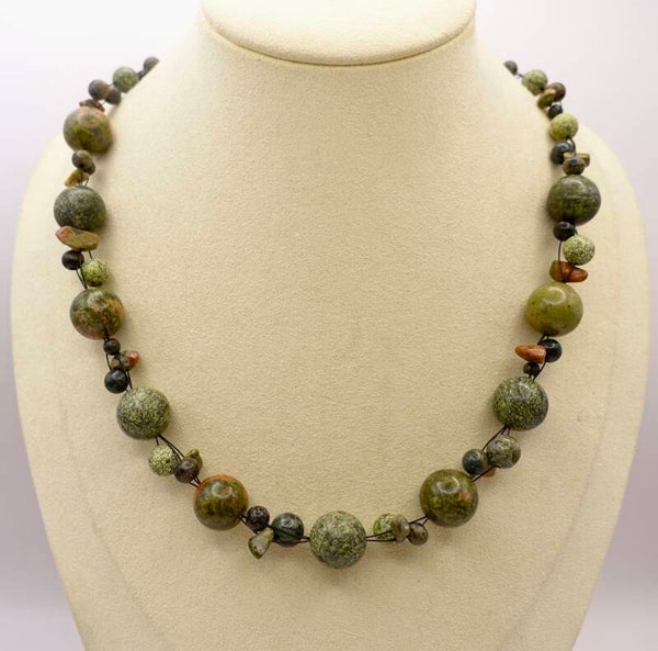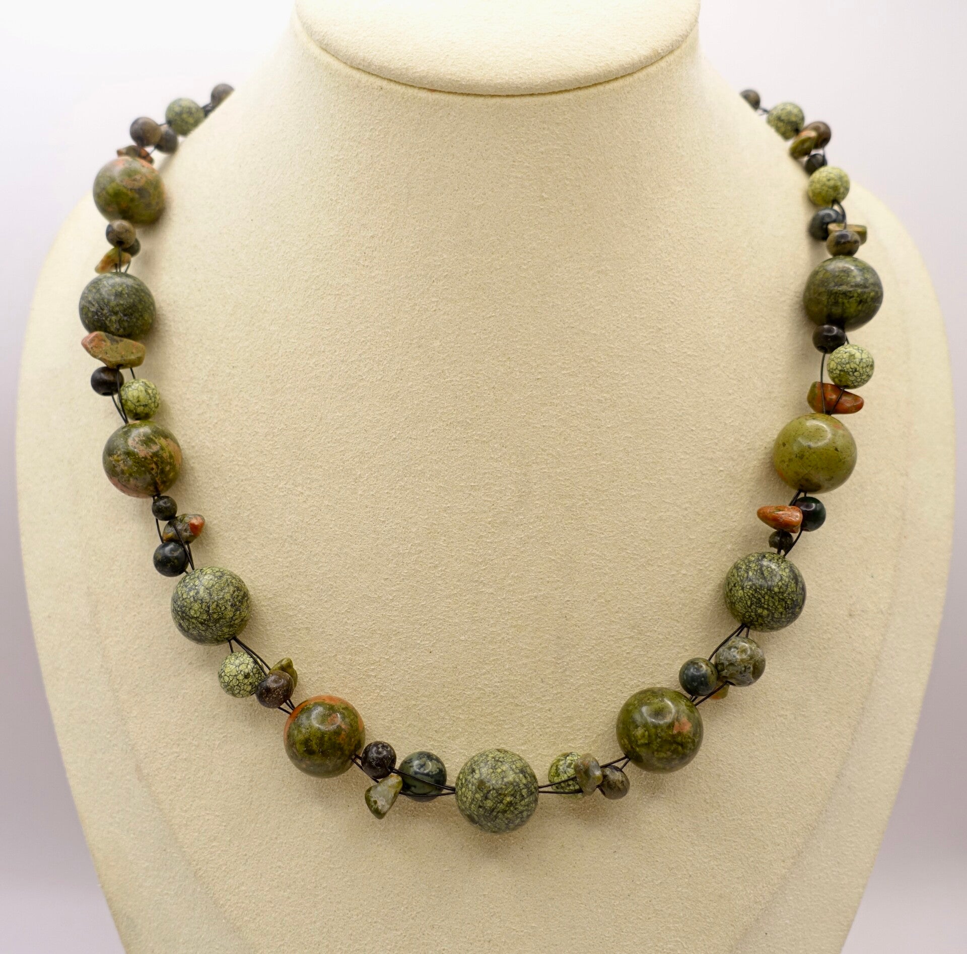 KKgr014625: Ketting van Russisch jade en unakiet. Groen- en terra-tinten.