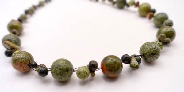 Ketting van Russisch jade en unakiet. Groen- en terra-tinten. Prachtige tekening van de kralen in puur materiaal. Mooi om solitair te dragen, maar ook prachtig met oorbellen OBzw014625 en/of ARgr014625.