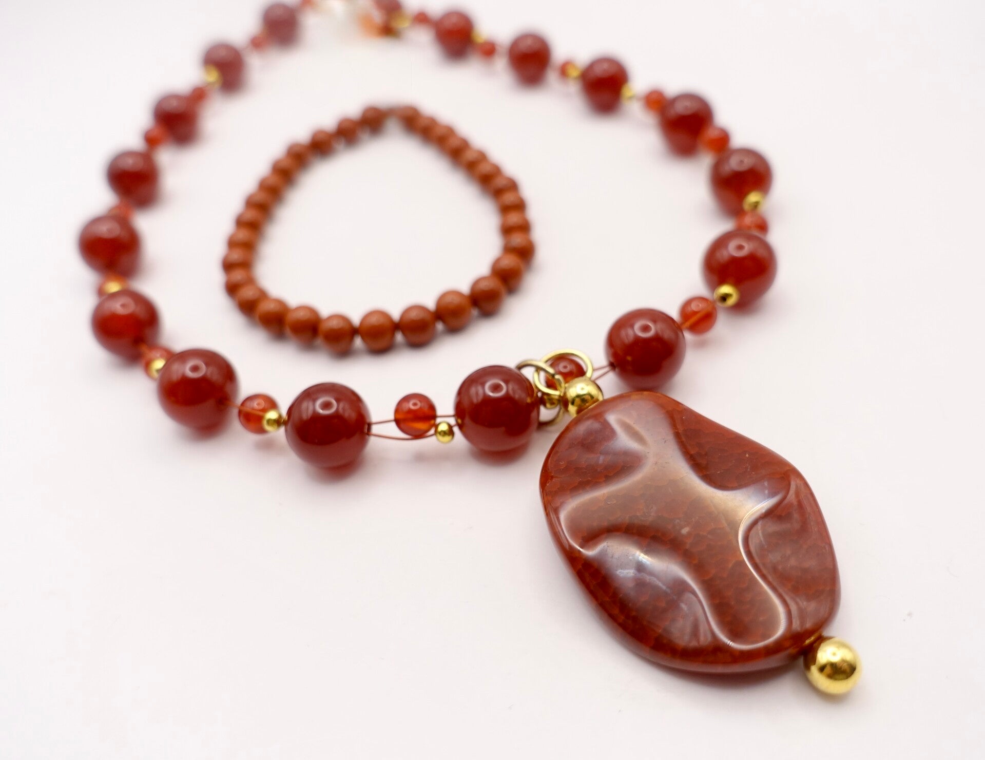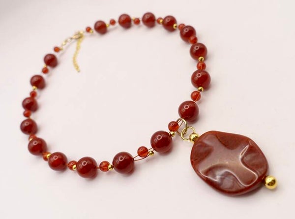 Diep terra ketting van carneool met grote agaat hanger op goudmetalen wisselspeld. Zowel de grote als de kleine kraaltjes zijn van carneool. Prachtige glans en kleur. Leuk samen met ARor014625.