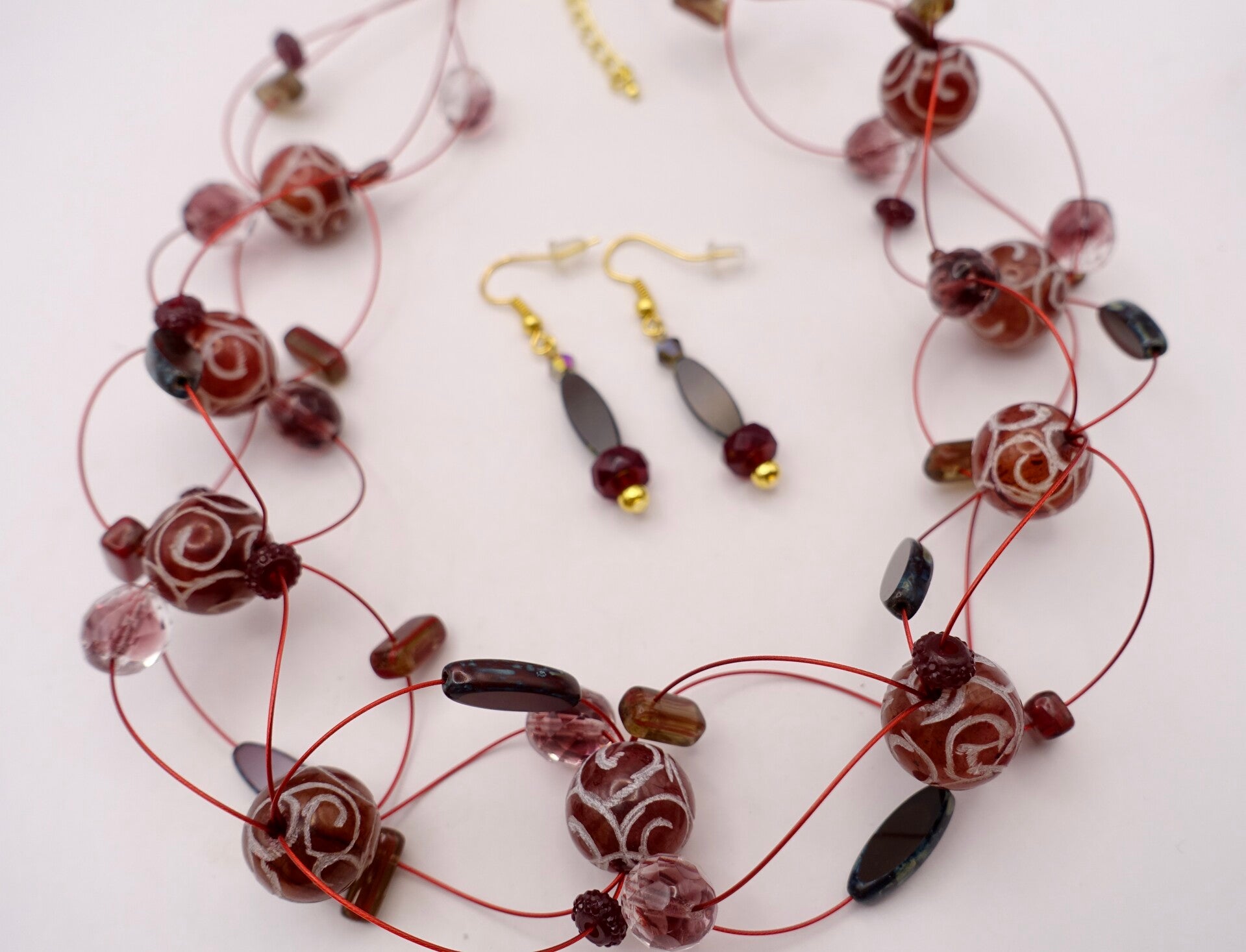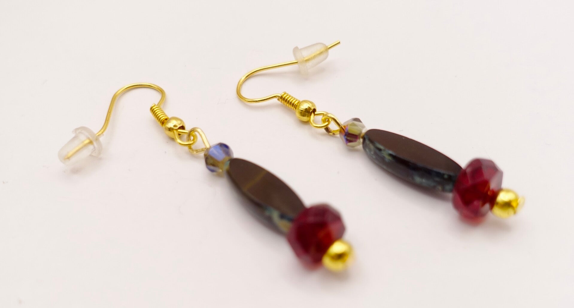 Oorhangers in diep donkerrood met goudmetaal afgewerkt. Prachtig om samen met ketting KKro024525 te dragen.