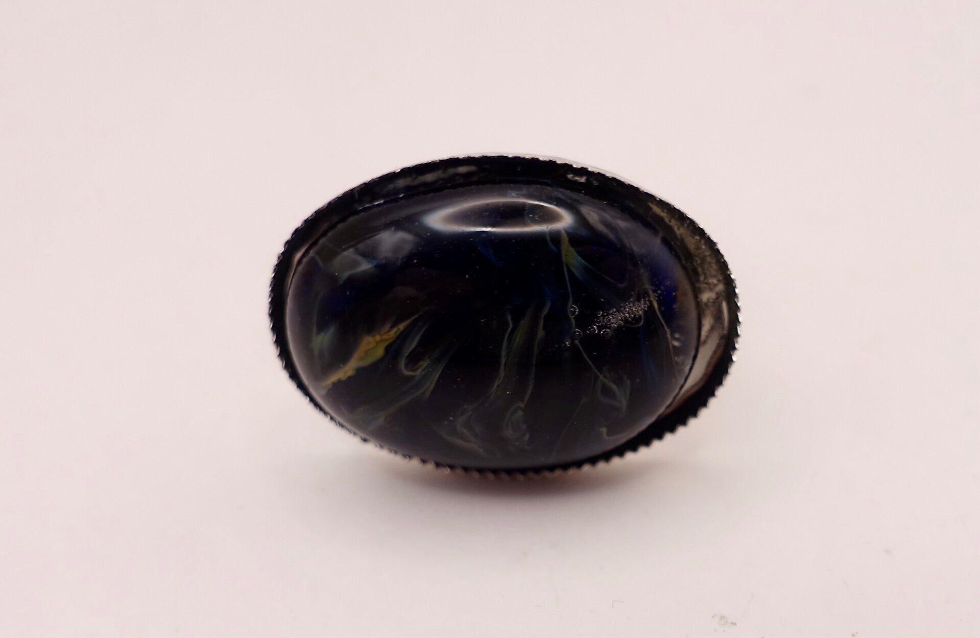 Aparte ring van zwart glas, in eigen atelier gefuseerd. Bij deze ring is de glas-steen overdwars geplaatst, heel apart.