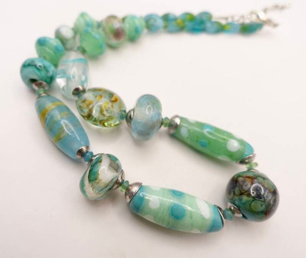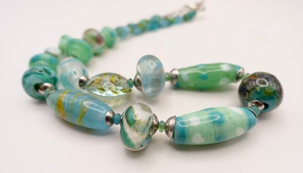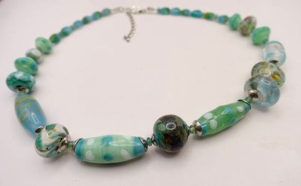 Zacht zeegroene ketting van handgemaakte glaskralen, met kralen in eigen atelier achter de brander gemaakt. Diverse vormen, prachtige combinatie. Mooi op groentinten, antraciet, zwart, donkerblauw, wit, etc.