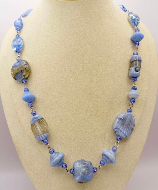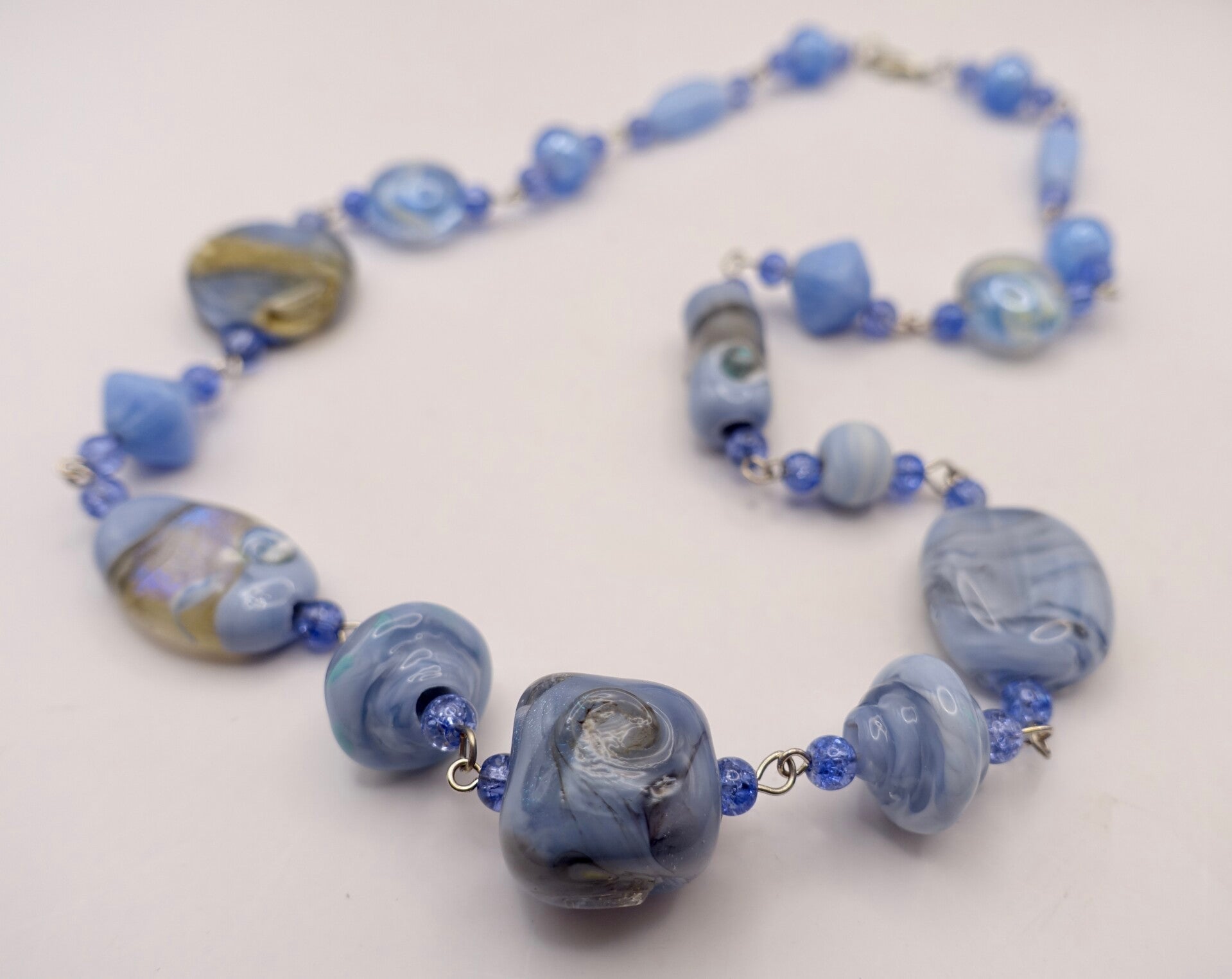 Halflange ketting in zacht, pastelblauw. Handmade glaskralen. Kralen met dichroic, waardoor een prachtige glans ontstaat, mooie patronen, diversiteit aan vormen. Deze ketting maakt je outfit helemaal af.
