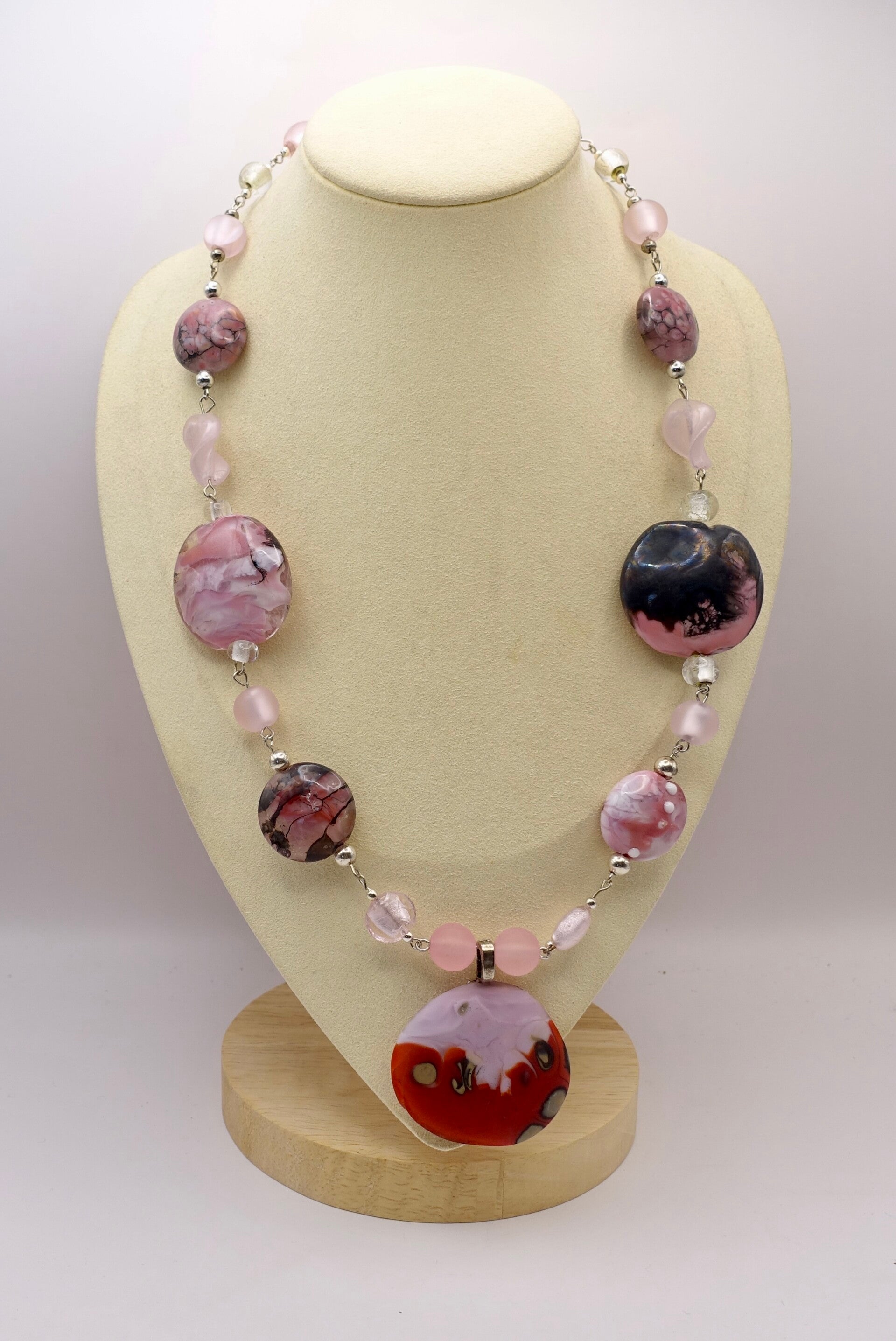 Halflange ketting in roze/rood van grote handmade glaskralen. Handmade glaskralen uit eigen atelier. Let op de schitterende patronen, de prachtige kralen, sommige gematteerd in een polijsttrommel, andere volg glans. Deze ketting moet je zien!
