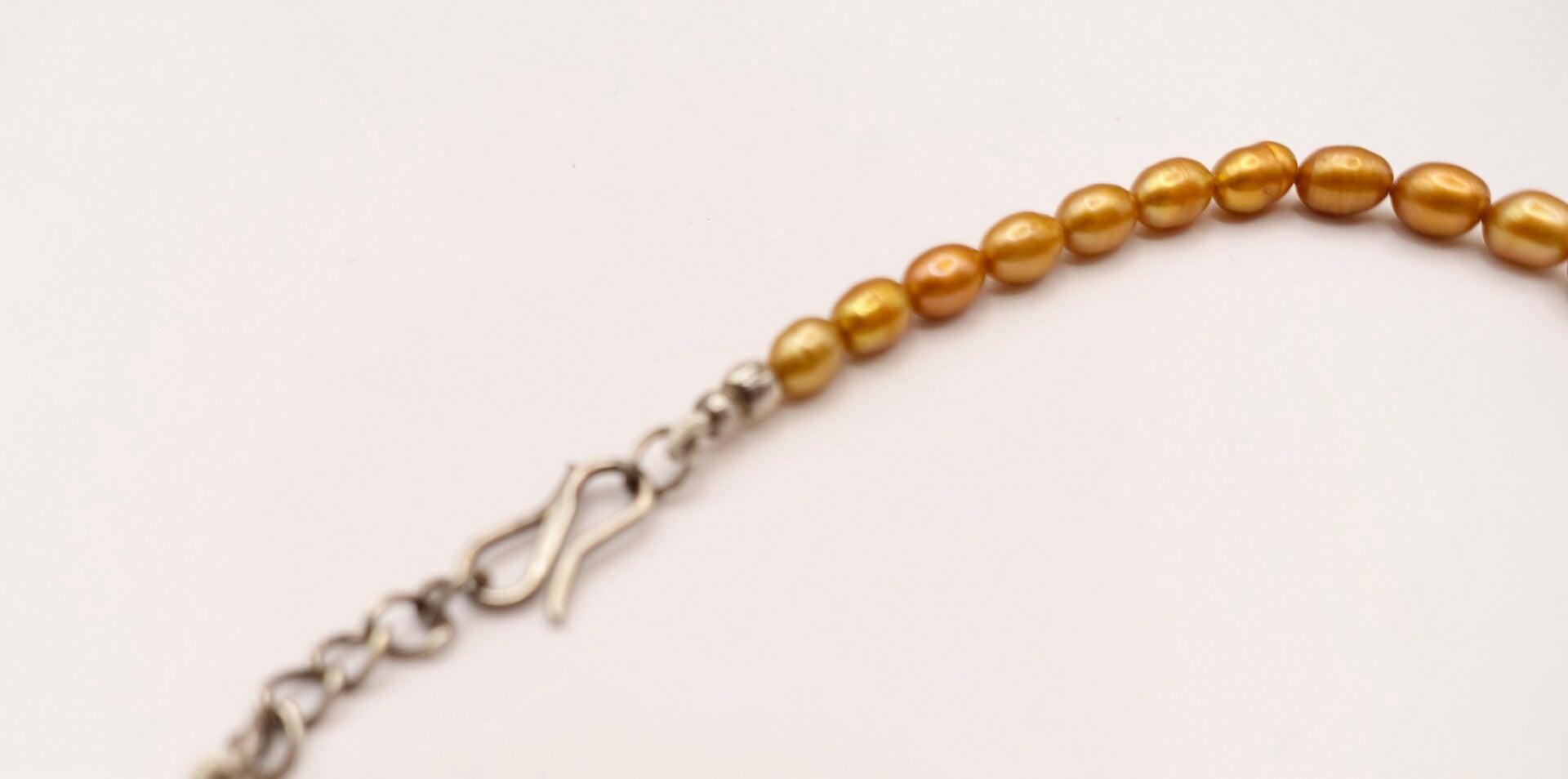 Ketting van zoetwaterpareltjes in goudkleur met zilveren slotje (sterling 925). De foto zegt alles.