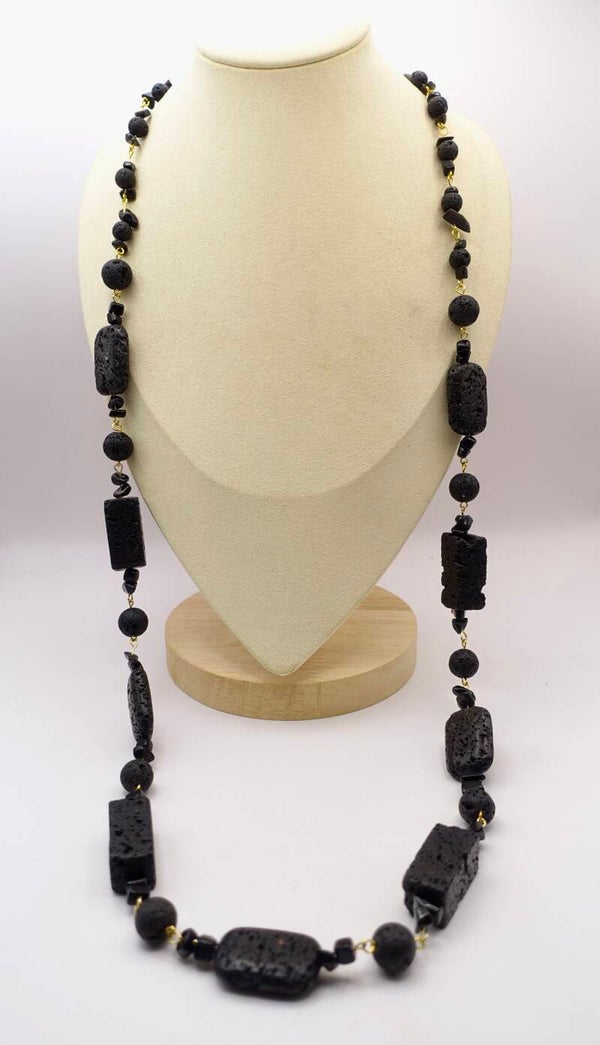 Lange, zwarte ketting van lava, met goudmetalen kraaltjes. Prachtig op een lange blouse og jurk. De foto spreekt voor zich.