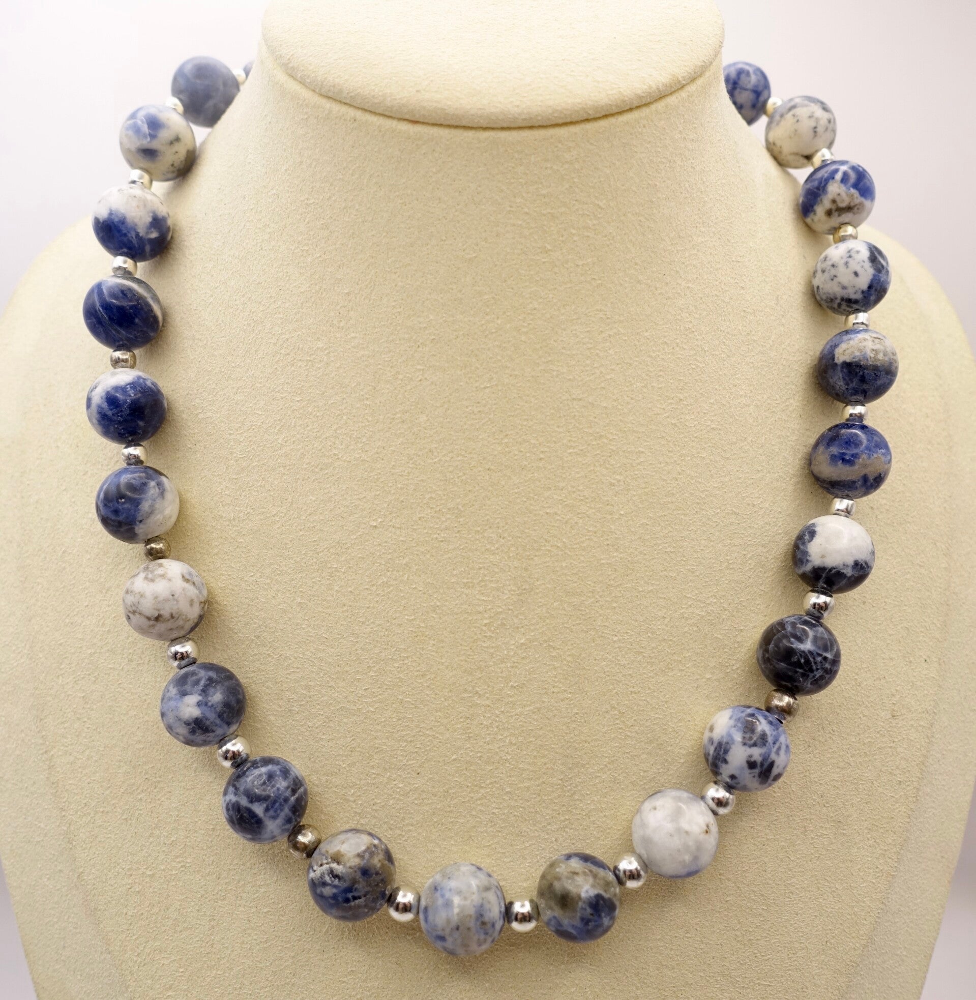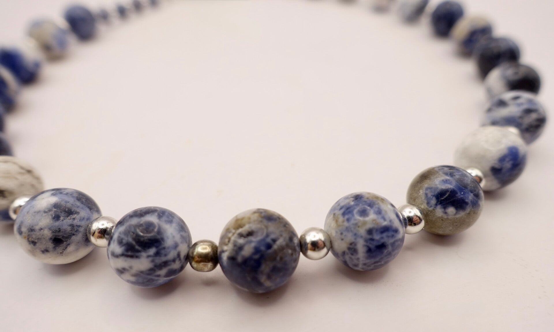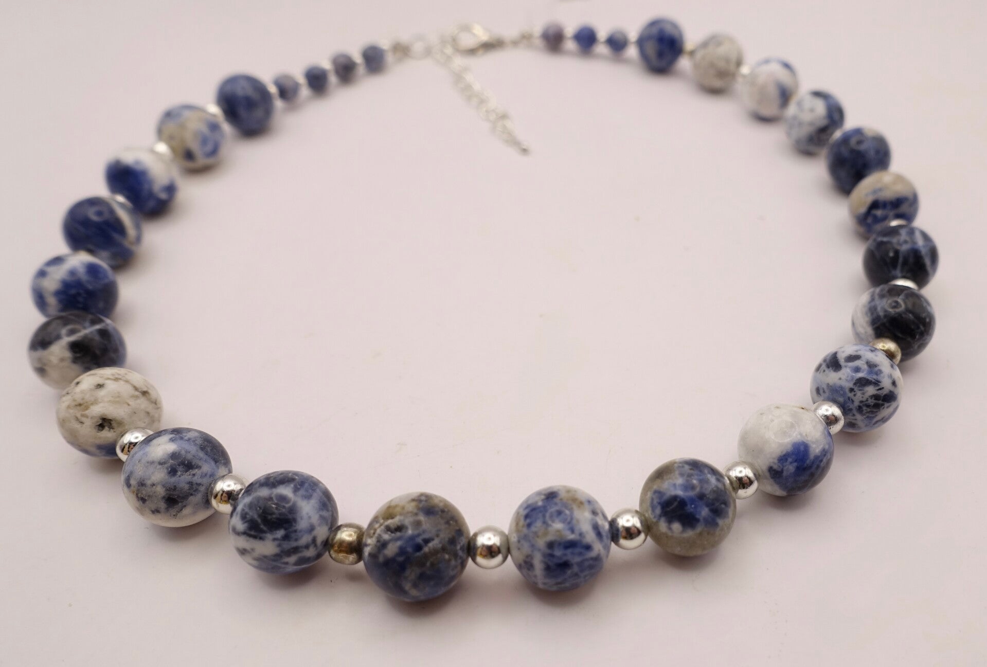 Blauw/witte ketting van prachtig sodaliet. De sodaliet is afgewisseld met zilvermetalen kraaltjes. Deze ketting is prachtig bij bijvoorbeeld een witte blouse, bij jeans, bij donkerblauw en nog heel veel meer.