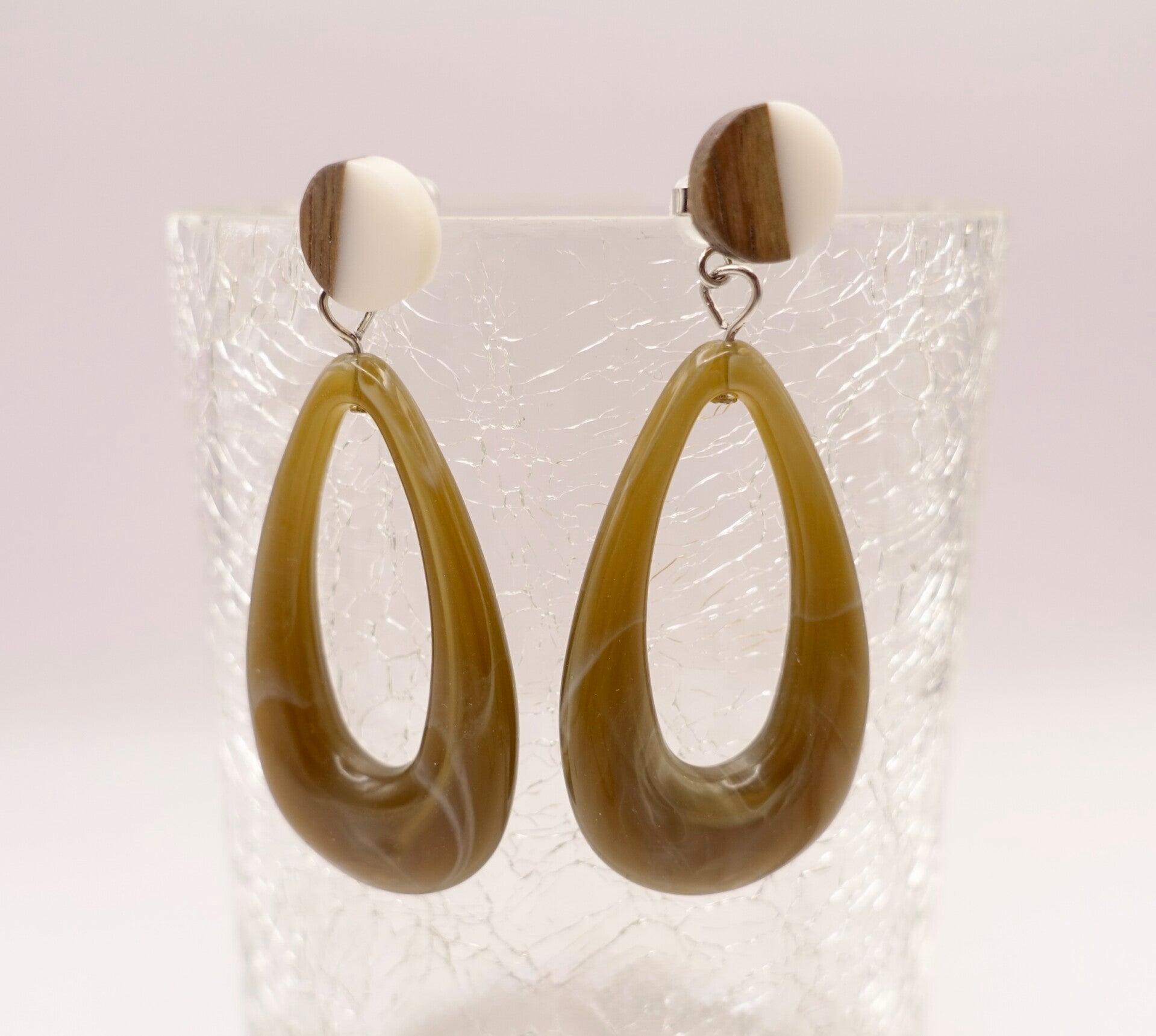 Gevlamde, mokka oorbellen aan prachtige stekers. Super lichtDe hangers zijn van resin gemaakt, de stekers van hout met nikkelvrij metaal. Totale lengte ca. 6cm.