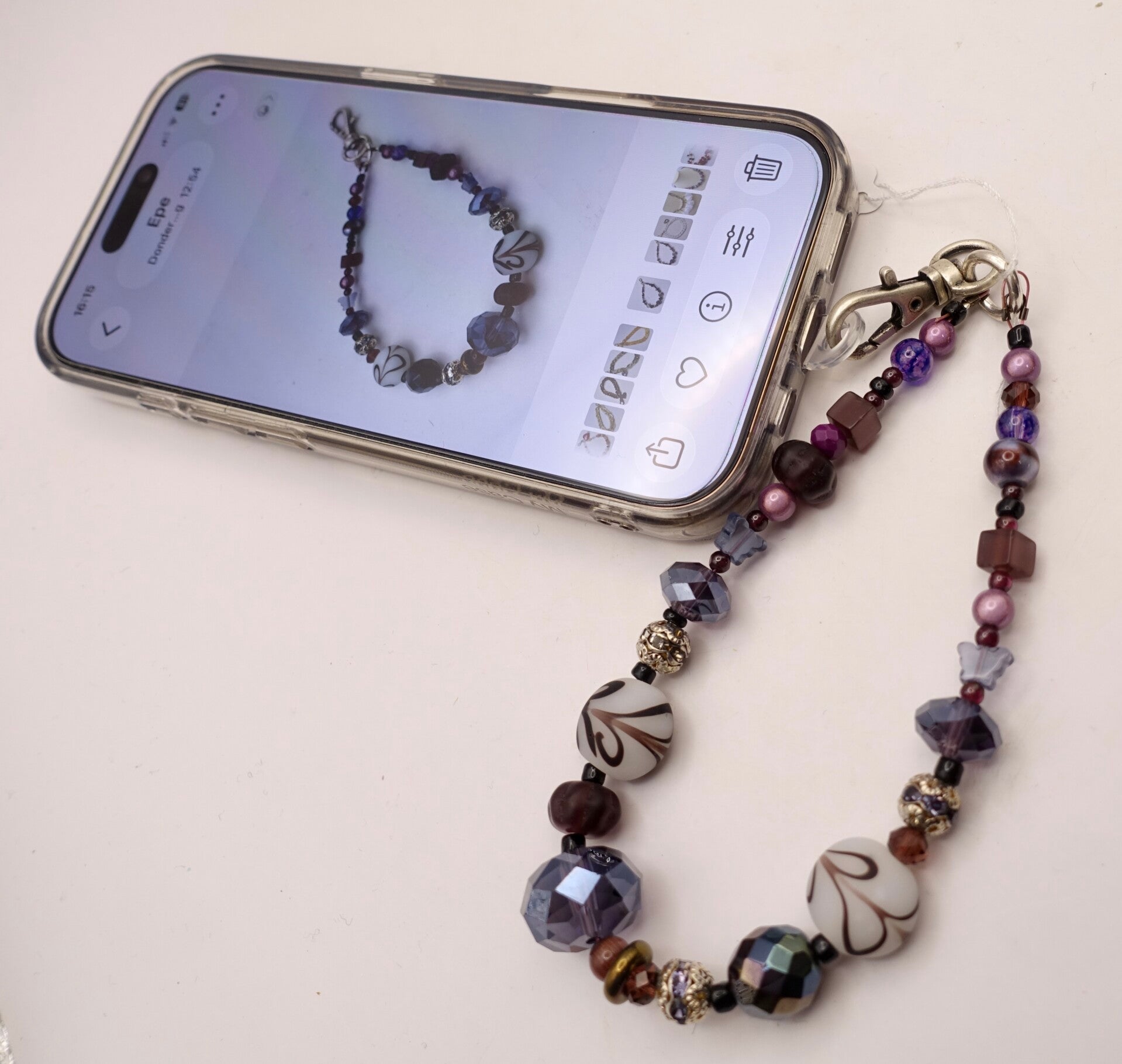 Telefoonpolsketting van paarse glaskralen. Prachtige facetglaskralen, Tsjechisch glas, etc. Zie voorbeeld op foto hoe te dragen.