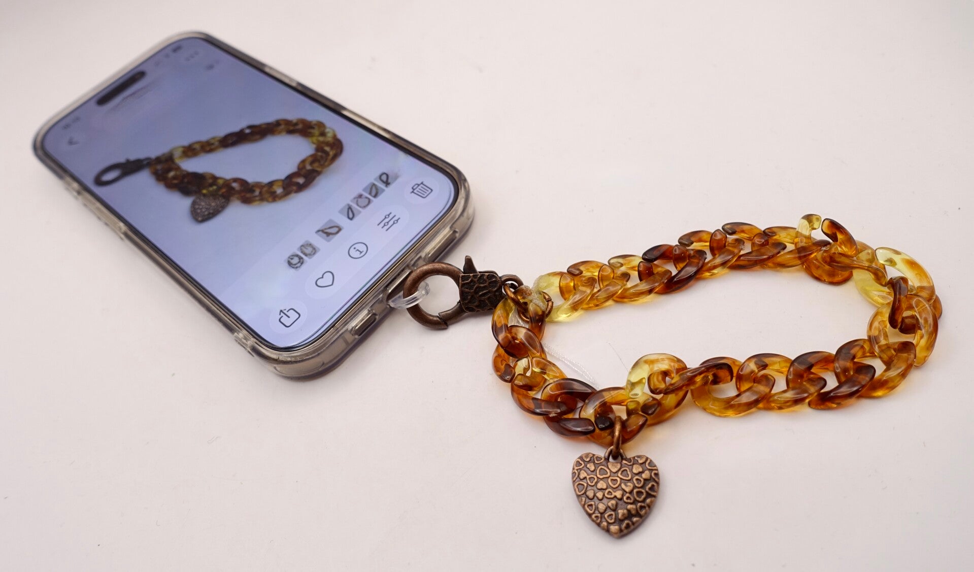Okergele, gevlamde telefoonpolsketting van schakels, met open bloem-bedel. Zie voorbeeld op foto hoe te dragen.