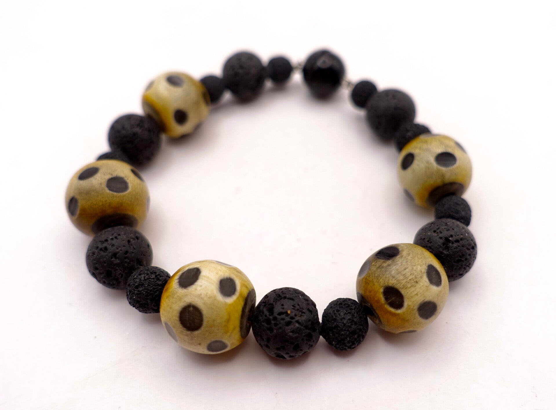 Ketting in zwart met ecru; lava, natuursteen, been en hout. Mooie, dubbele laag. Prachtig samen met armband ARec010826.