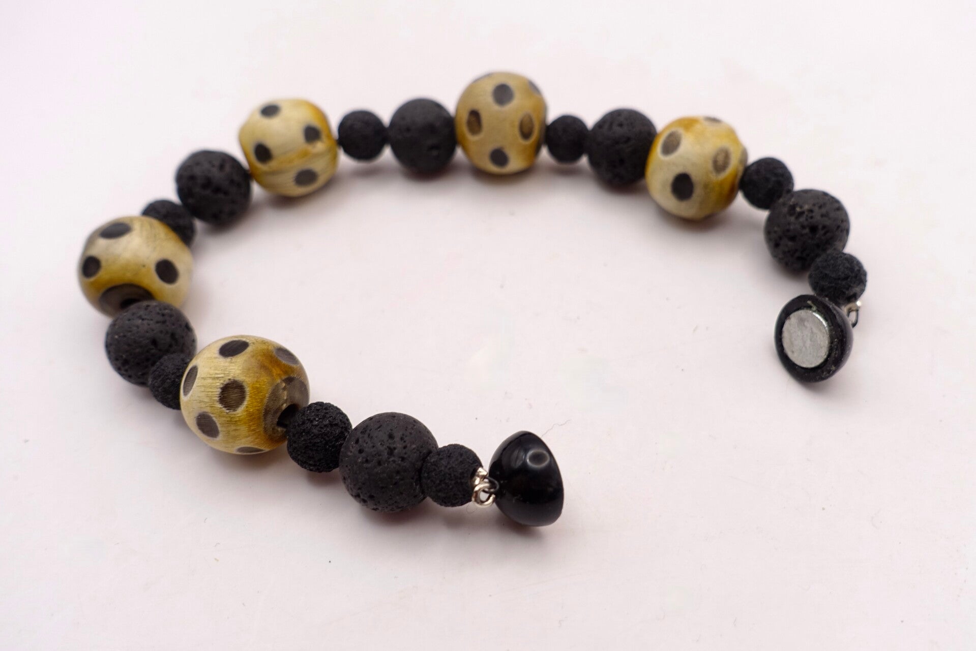 Armband in zwart met ecru; lava en hout. Met heel mooie, stevige magneetsluiting.Prachtig samen met ketting KKec010826.