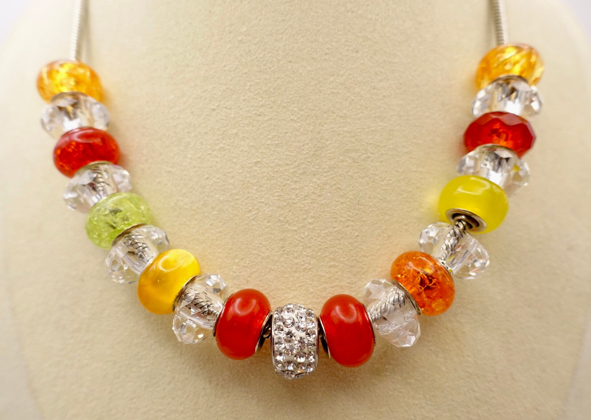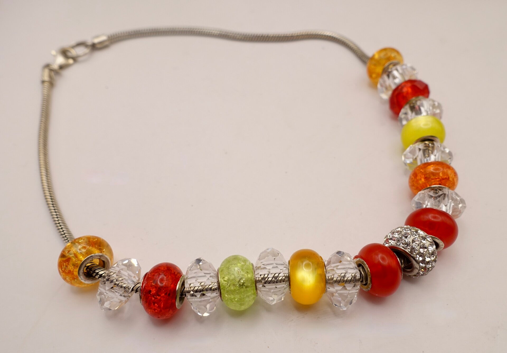 Ketting geschikt voor wisselkralen van de bekende merken. In de kleuren rood, geel, oranje, groen en transparant. 1 Strasskraal in het midden. De rest is resin materiaal. Voor een heel speciaal prijsje.